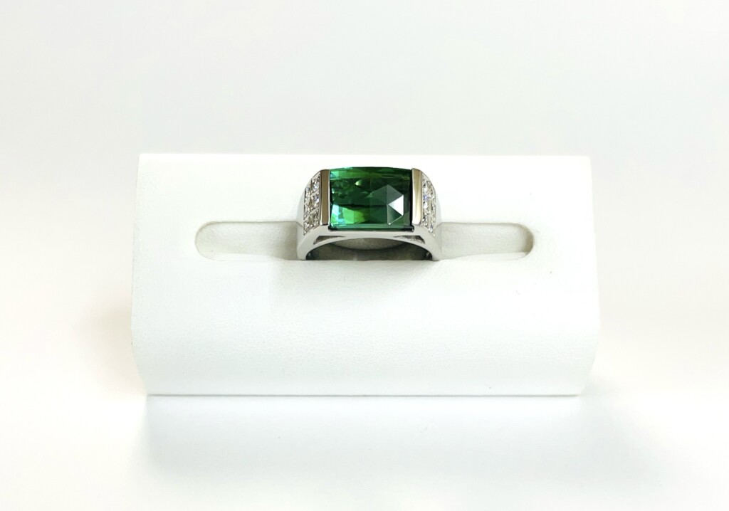 グリーントルマリンの両脇にはダイヤモンドが各6P(合計12P)埋め込まれています。