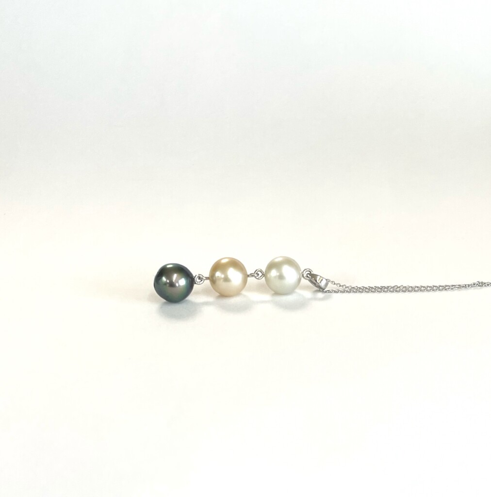 直径8.8~9㎜の黒蝶真珠、あこや真珠、ゴールデンパールの3色の真珠を使用しています。